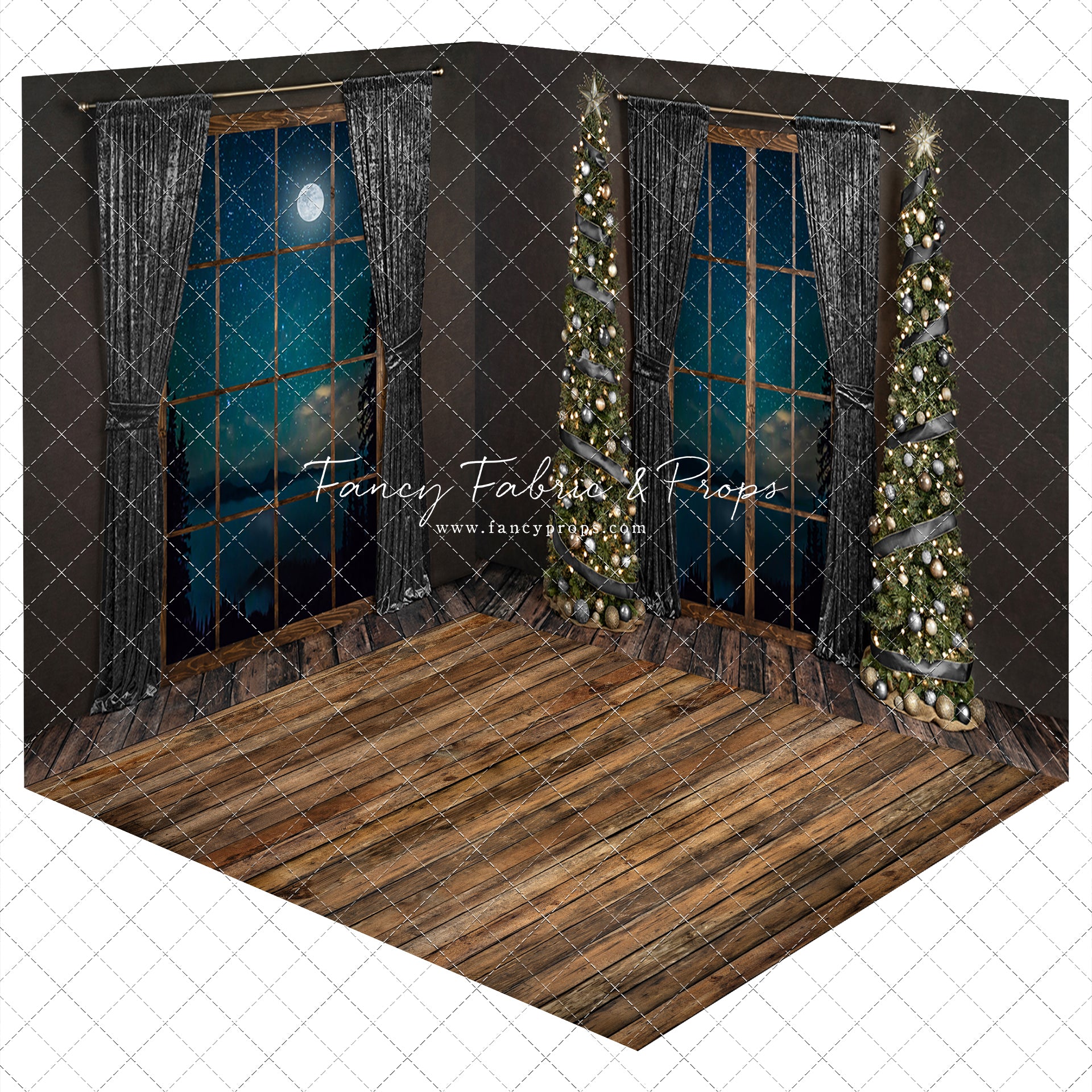 3 piece set meant to be mounted/hung/displayed in the corner of your space for a 3D "room" effect! Fabric backdrops and mat floor will ship and arrive separately.