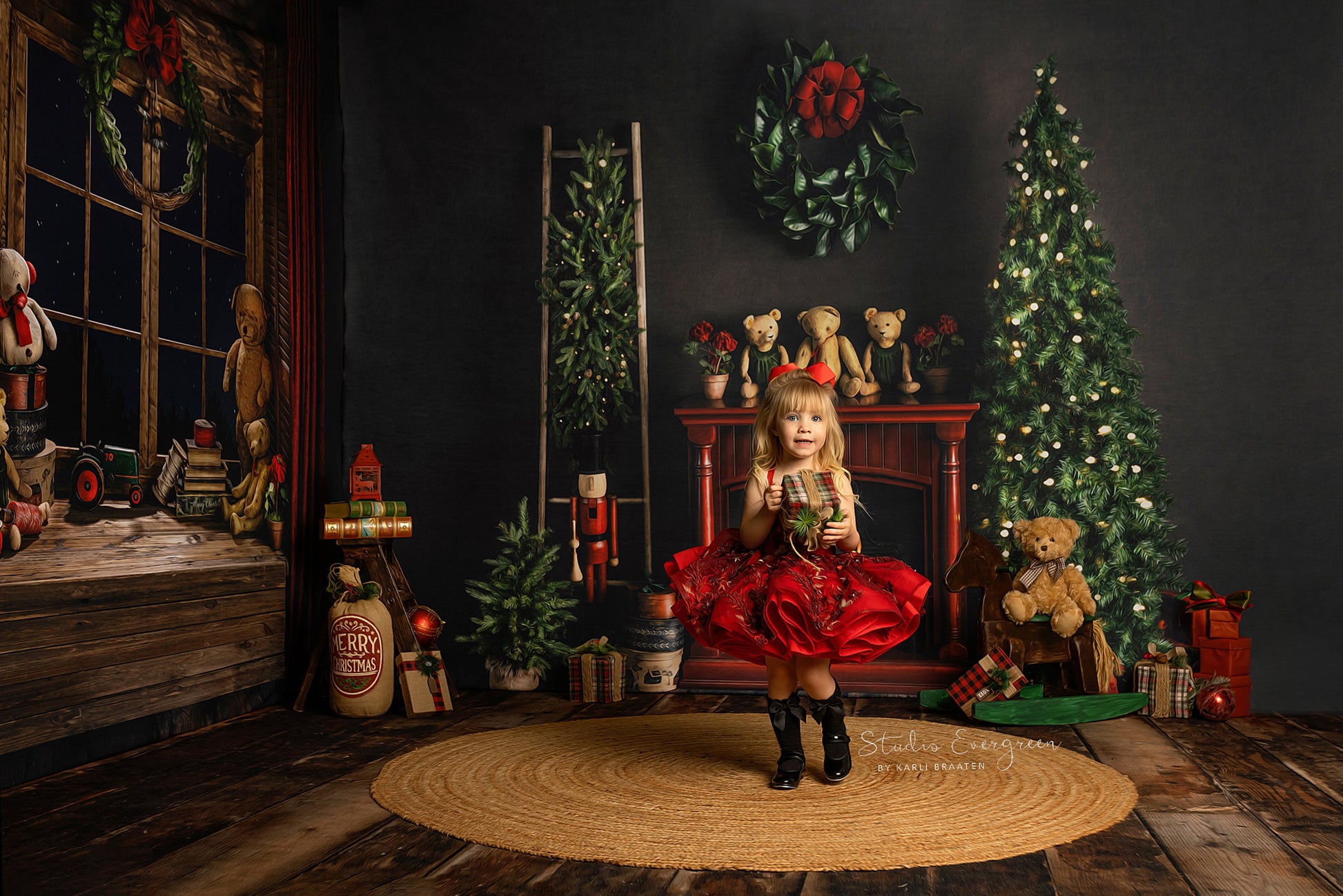 3 piece set meant to be mounted/hung/displayed in the corner of your space for a 3D "room" effect! Fabric backdrops and mat floor will ship and arrive separately.