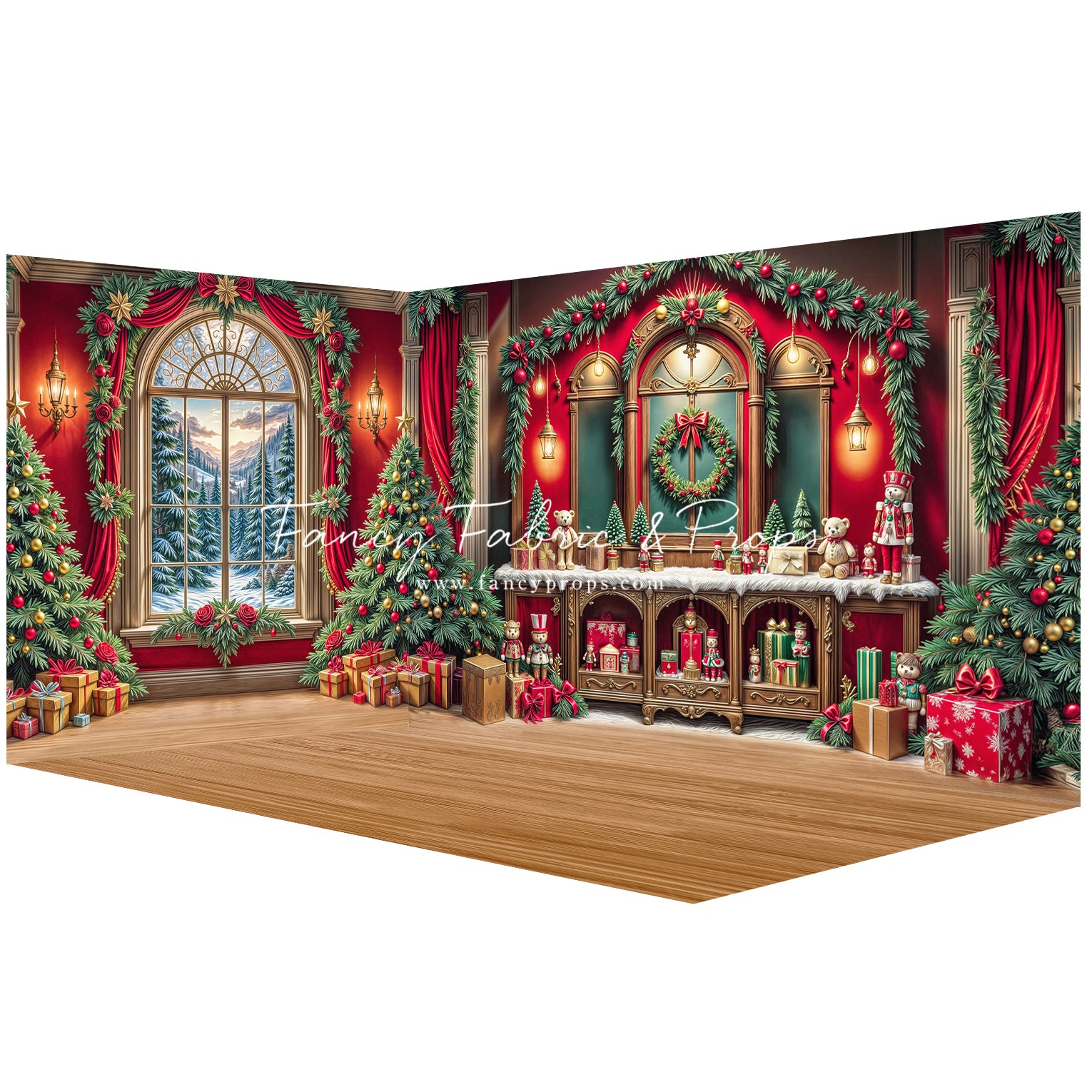 3 piece set meant to be mounted/hung/displayed in the corner of your space for a 3D "room" effect! Fabric backdrops and mat floor will ship and arrive separately.